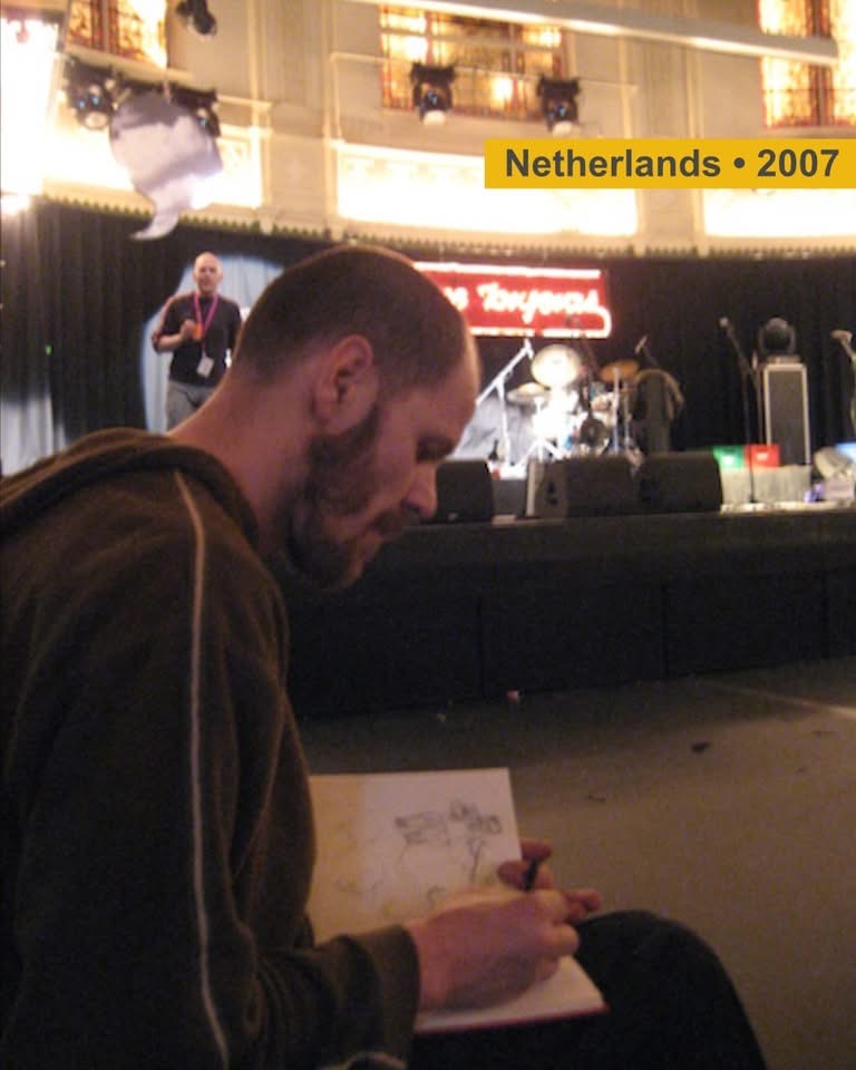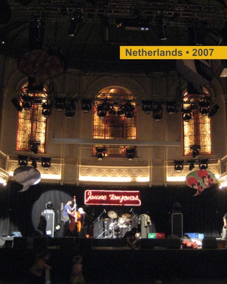 2007 Amsterdam. Paradiso. Spotlights on the bass. Drums waiting. Hamburger philosophy backstage.