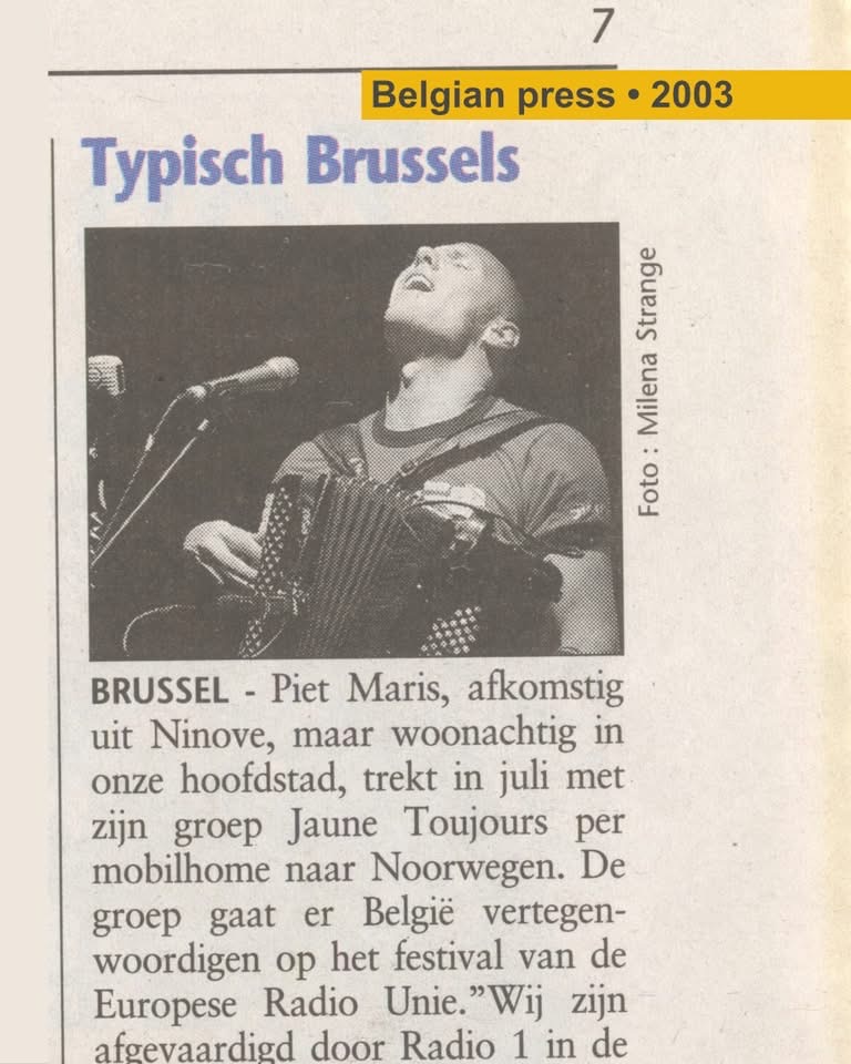 Throwback to 9 years ago Jaune Toujours kicking off Gentse Feesten 2016 with a 3 hour concert, celebrating 20sth years on stage with several guests: Bassel Abou Fakher from Qotob Trio on cello, Jo Zanders & DROM on percussion, Katarina Pohlodkova and Milka Pohlodkova from Mec Yek on vocals… Trefpunt Festival St-Jacobs on fire!