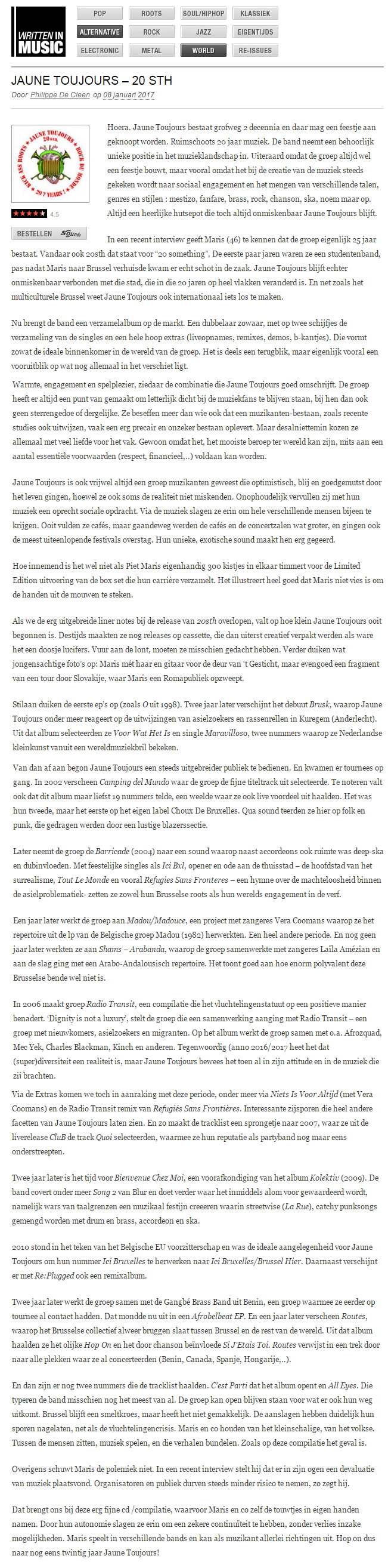’20sth’ – 4,5/5 REVIEW BY WRITTENINMUSIC.COM – ” mestizo, fanfare, brass, rock, chanson, ska, noem maar op. Altijd een heerlijke hutsepot die toch altijd onmiskenbaar Jaune Toujours blijft.”