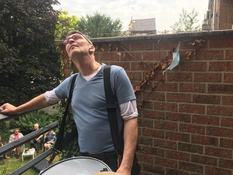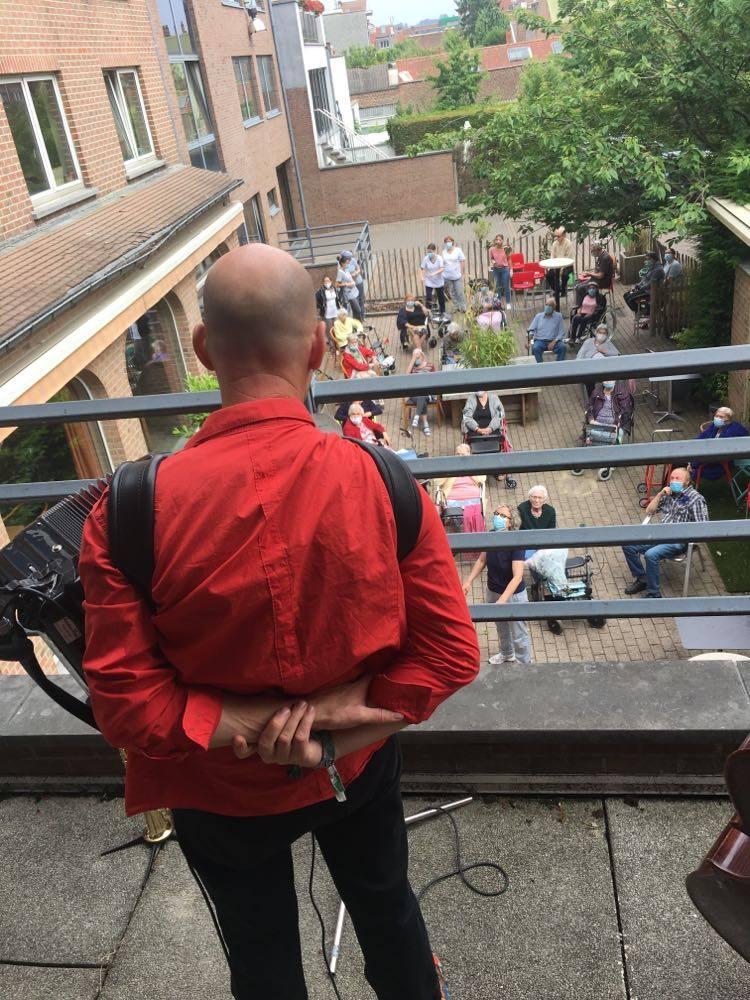 The elderly residents at Seniorie Bizet in Anderlecht can not receive visitors on a regular basis just yet, so in order to cheer them up a little, their caretakers asked Jaune Toujours to play an open air concert.