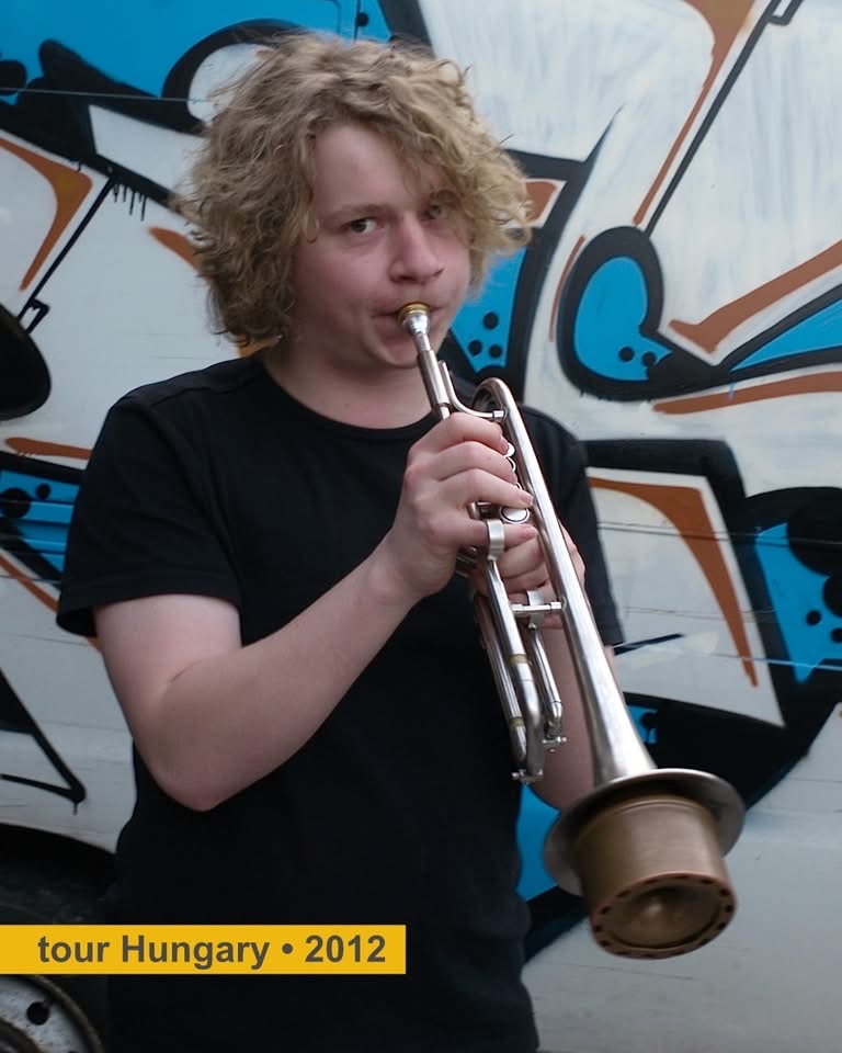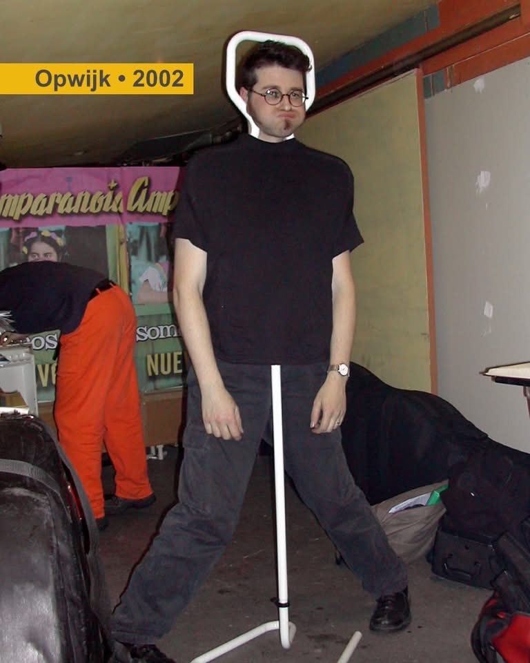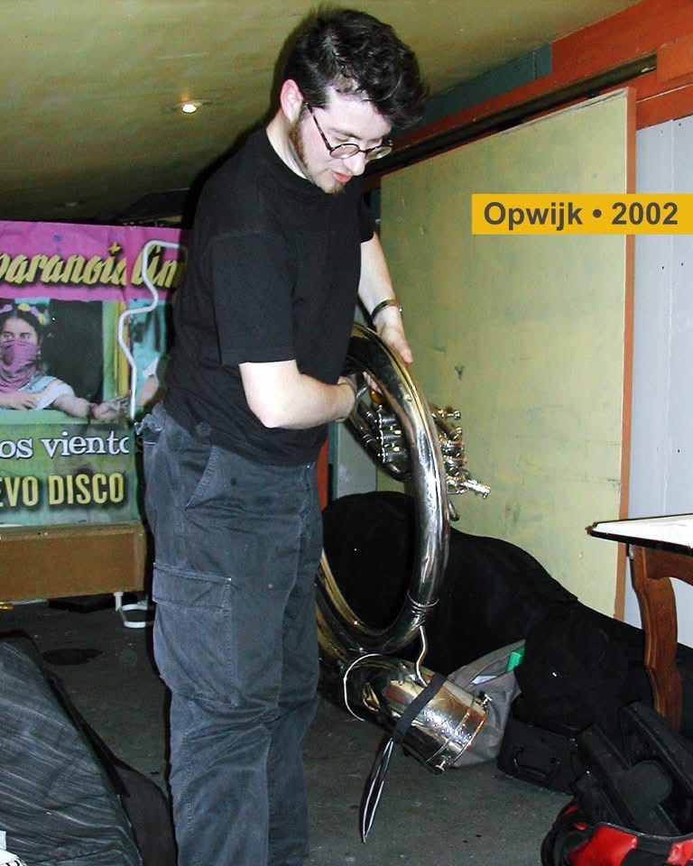 2002 Opwijk. Backstage. Sousaphone, laughter, time to spare.